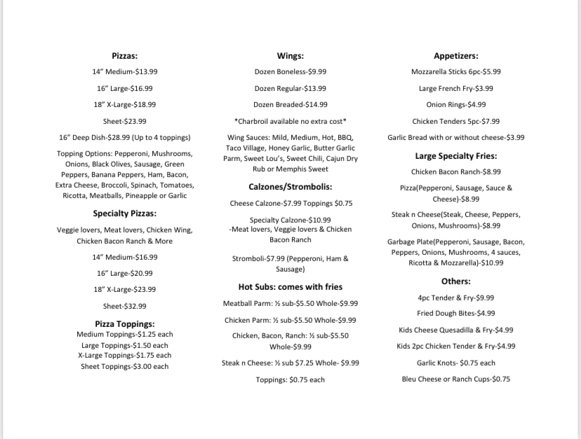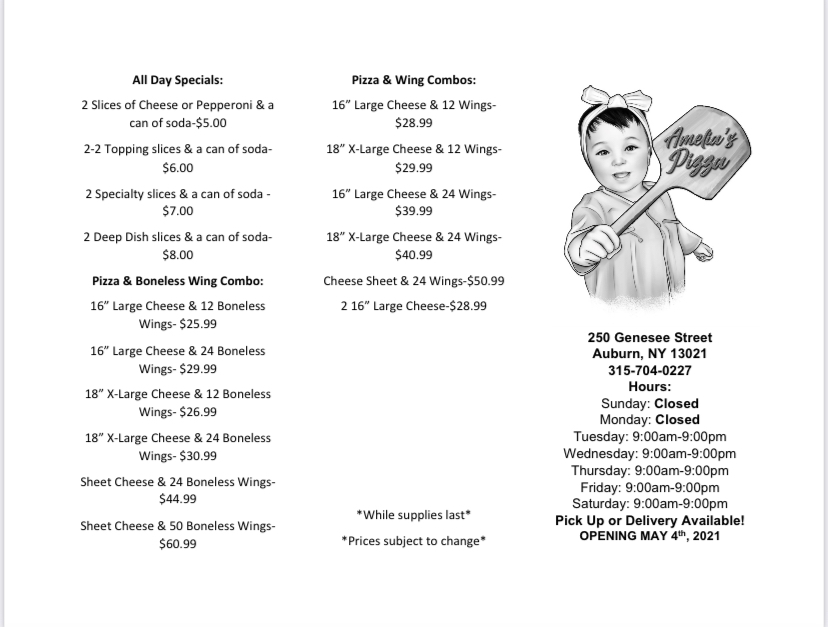 From a reviewer's perspective, Amelia's Pizza at 250 Genesee St offers a menu that balances classic comfort foods with hearty Italian favorites. The Calzones/Strombolis section features the Cheese Calzone, Specialty Calzone, and Stromboli, each promising a satisfying, golden-crusted bite. For sandwich lovers, the Hot Subs, all served with fries, include standout options like Meatball Parm, Chicken Parm, and Chicken, Bacon, Ranch, alongside the hearty Steak N Cheese. Appetizers provide tempting starters such as Mozzarella Sticks 6pc, Large French Fry, Onion Rings, Chicken Tenders 5pc, and Garlic Bread With Or Without Cheese. There’s also a playful mix of smaller treats under “Others,” including 4pc Tender & Fry, Fried Dough Bites, Kids Cheese Quesadilla & Fry, Kids 2pc Chicken Tender & Fry, and Garlic Knots, catering to both kids and adults alike. For those seeking value, the All Day Specials deliver convenient combinations like 2 Slices Of Cheese Or Pepperoni & A Can Of Soda, 2-2 Topping Slices & A Can Of Soda, 2 Specialty Slices & A Can Of Soda, and 2 Deep Dish Slices & A Can Of Soda, making it easy to grab a quick yet satisfying meal. Overall, the menu at Amelia’s Pizza combines variety, classic flavors, and kid-friendly options, with both sharable appetizers and meal deals that appeal to families and casual diners.